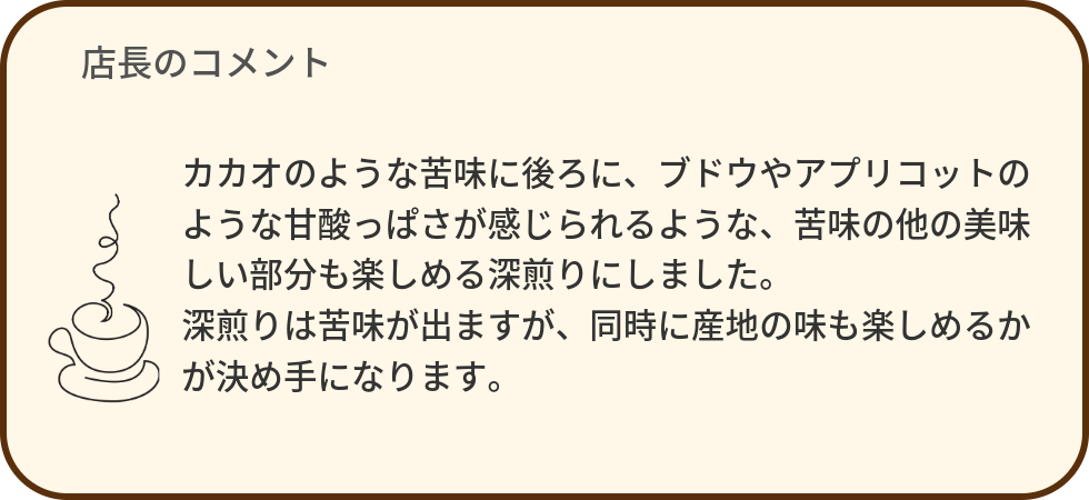 苦味も感じつつ、爽やかさも出すために、深煎りの中では浅めの焙煎にしました。